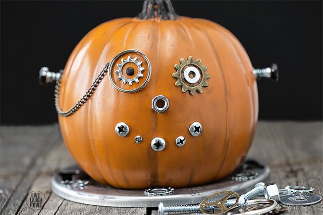 Combine gears, chains, and metallic hardware to give a pumpkin a mechanical, steampunk look. This style is great for older kids to explore texture and design.